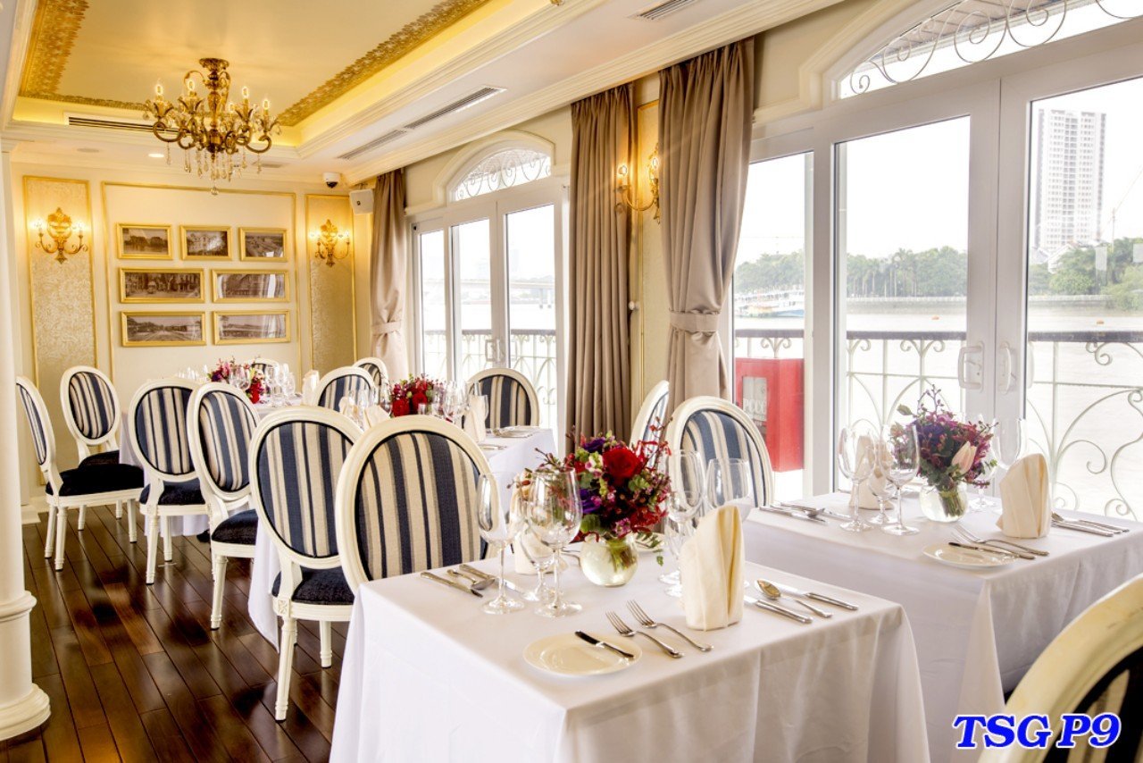“Nhà hàng ẩm thực” trên sông thật sự là điểm hẹn ẩm thực xứng tầm 5 sao, mang đến những món ăn đặc sắc theo phong cách ẩm thực Á – Âu từ các đầu bếp lừng danh. Trên tàu Sài Gòn, từng chi tiết nhỏ trong món ăn đến cách bày trí bàn ăn đều được chăm chút kĩ lưỡng, với đội ngũ phục vụ luôn sẵn sàng hỗ trợ khách tại mọi vị trí trên tàu.