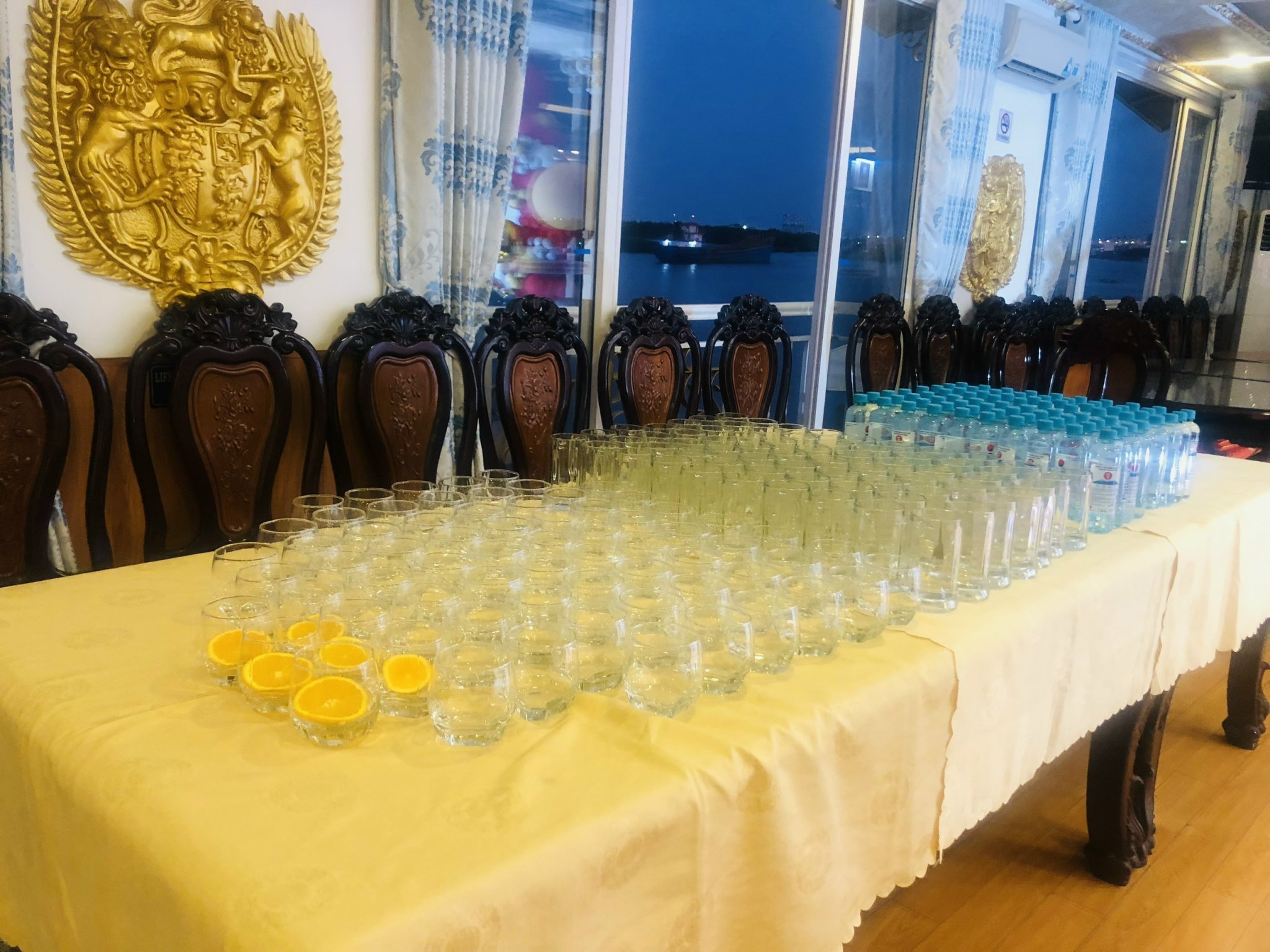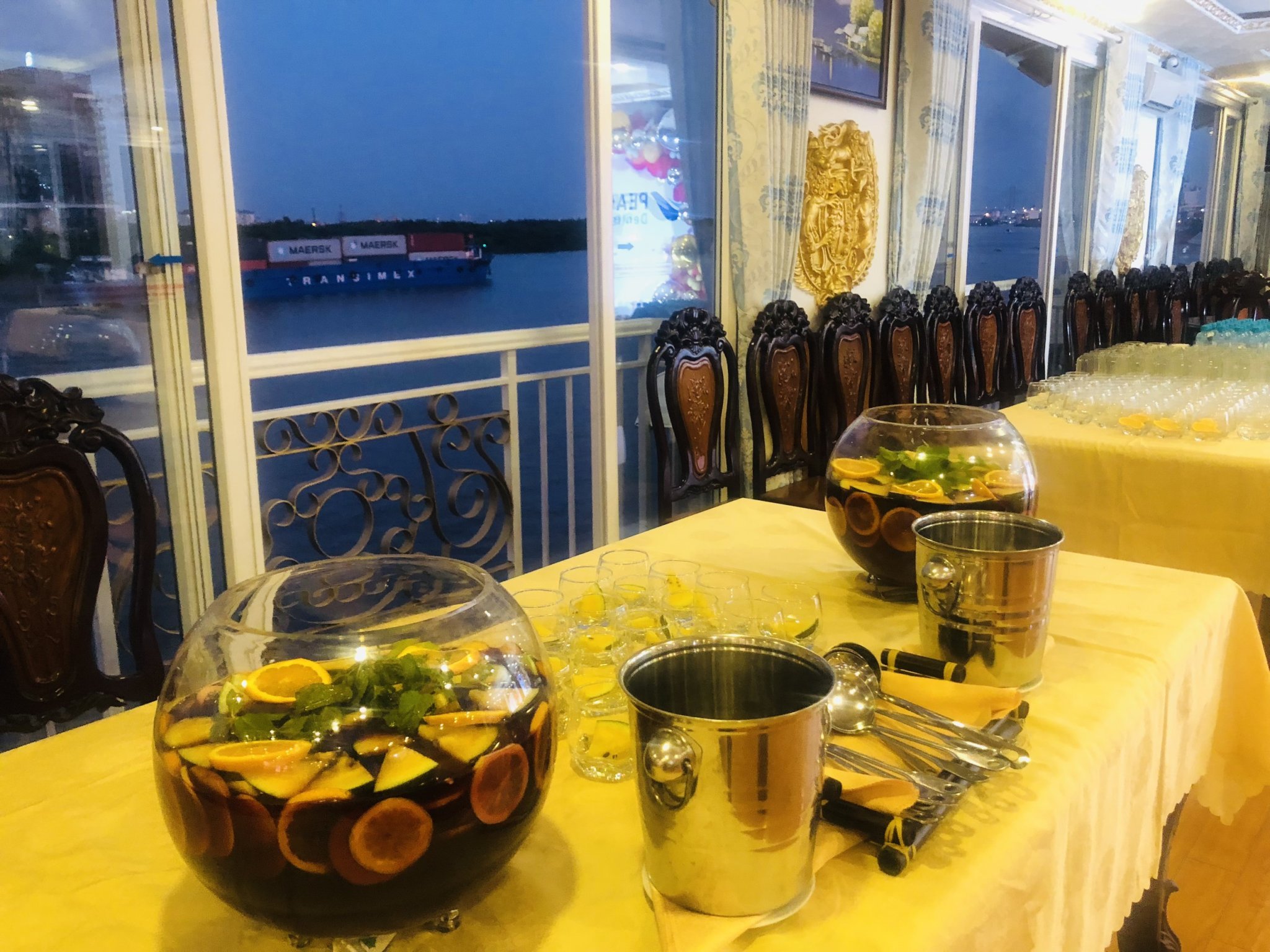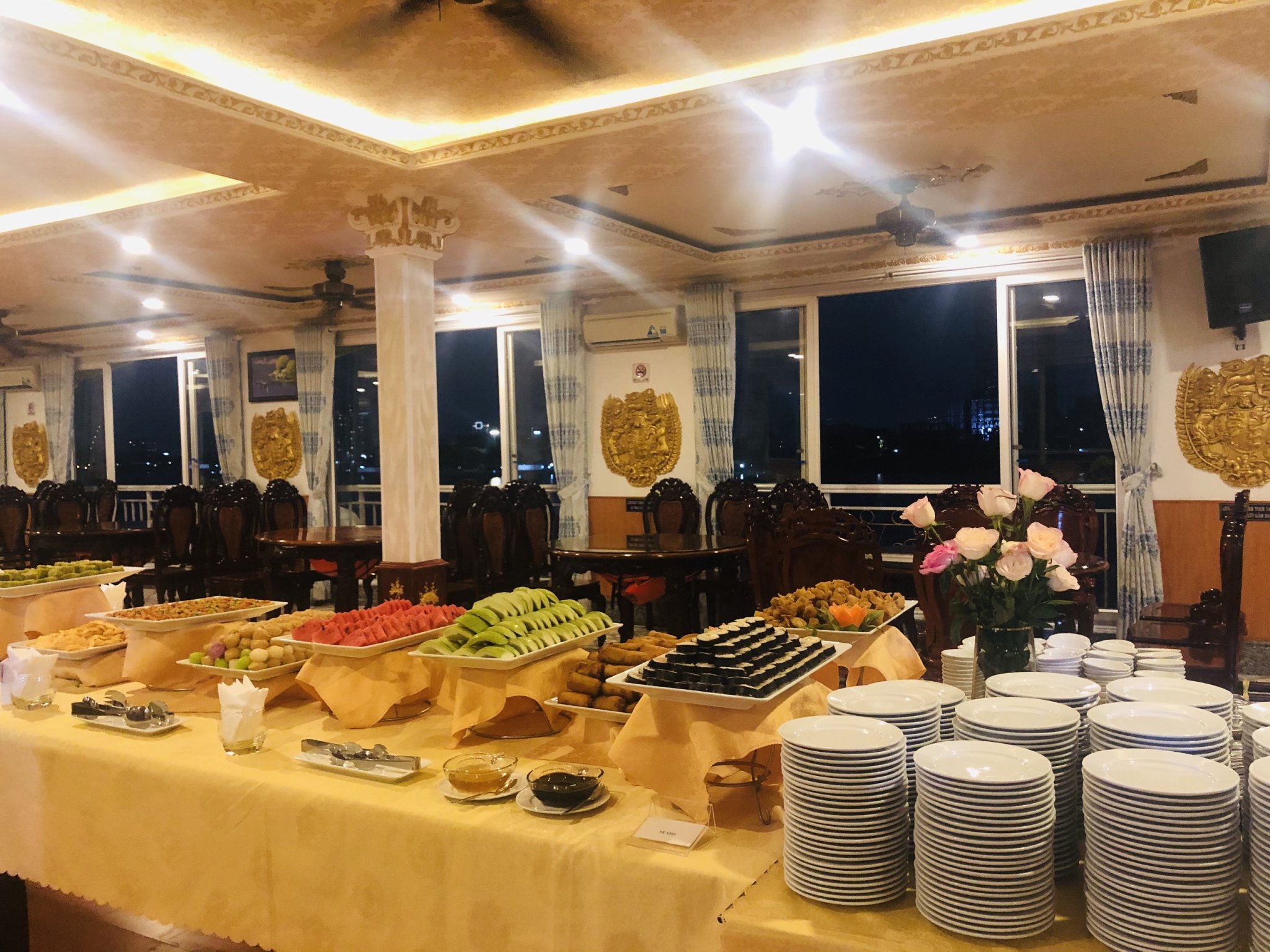 - Khách bắt đầu được đón lúc 18h30, buổi tiệc khởi động lúc 19h00, tàu xuất phát lúc 19h45 và cập bến lúc 21h15.